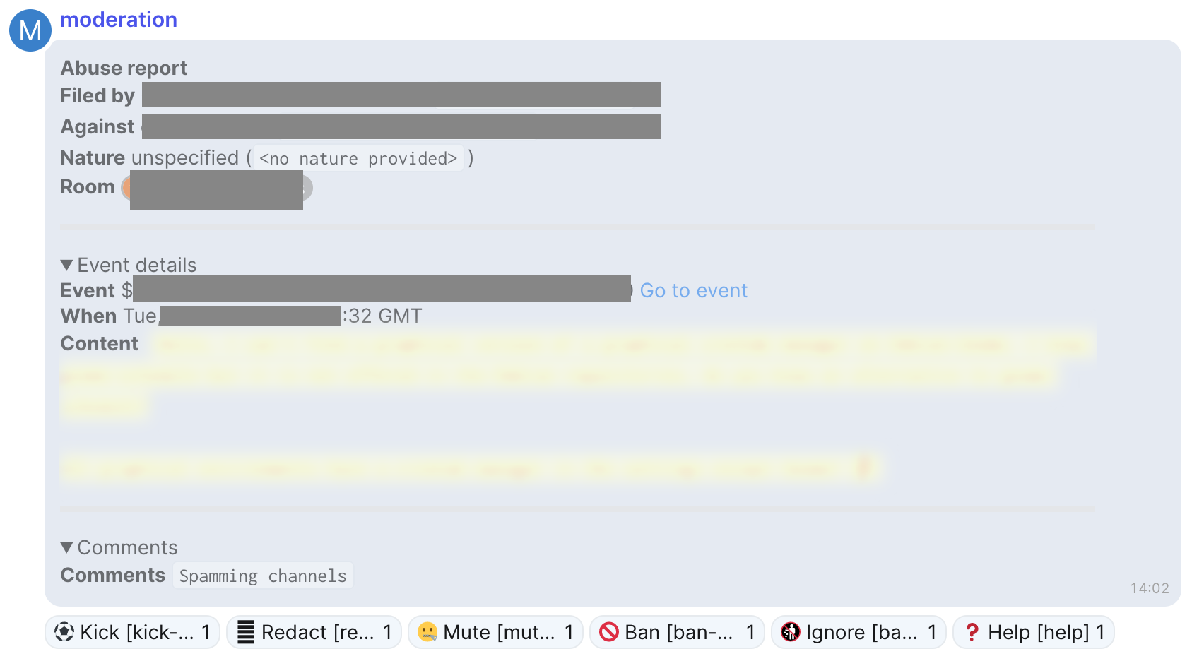 There are two ways to redact a message. You can click the 🗍 Redact button underneath a report, if you are using those reports. You can also redact a particular message by sending a message in Mjolnir's control room. This method is useful when you haven't received a report about a message, but you want to redact it.