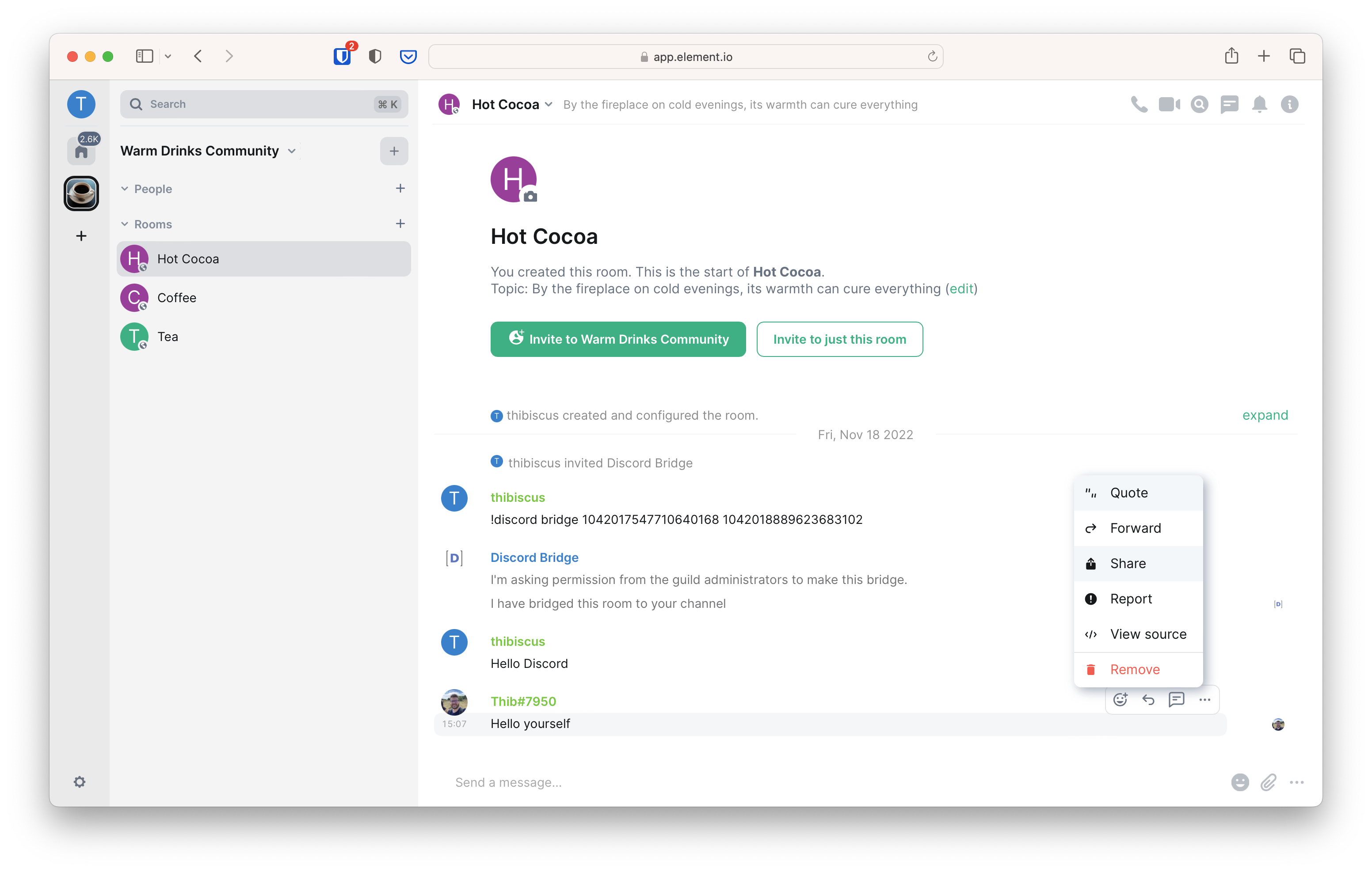 • Users can send messages, media, reactions and redact their own messages in a room.